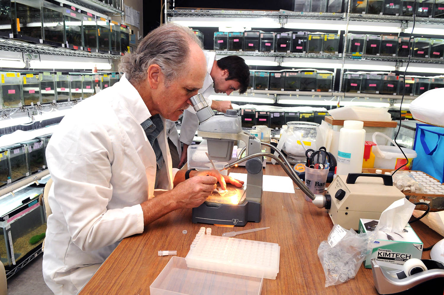 (c) UCR - Professor Davi Reznick looking through a microscope in a biology lab